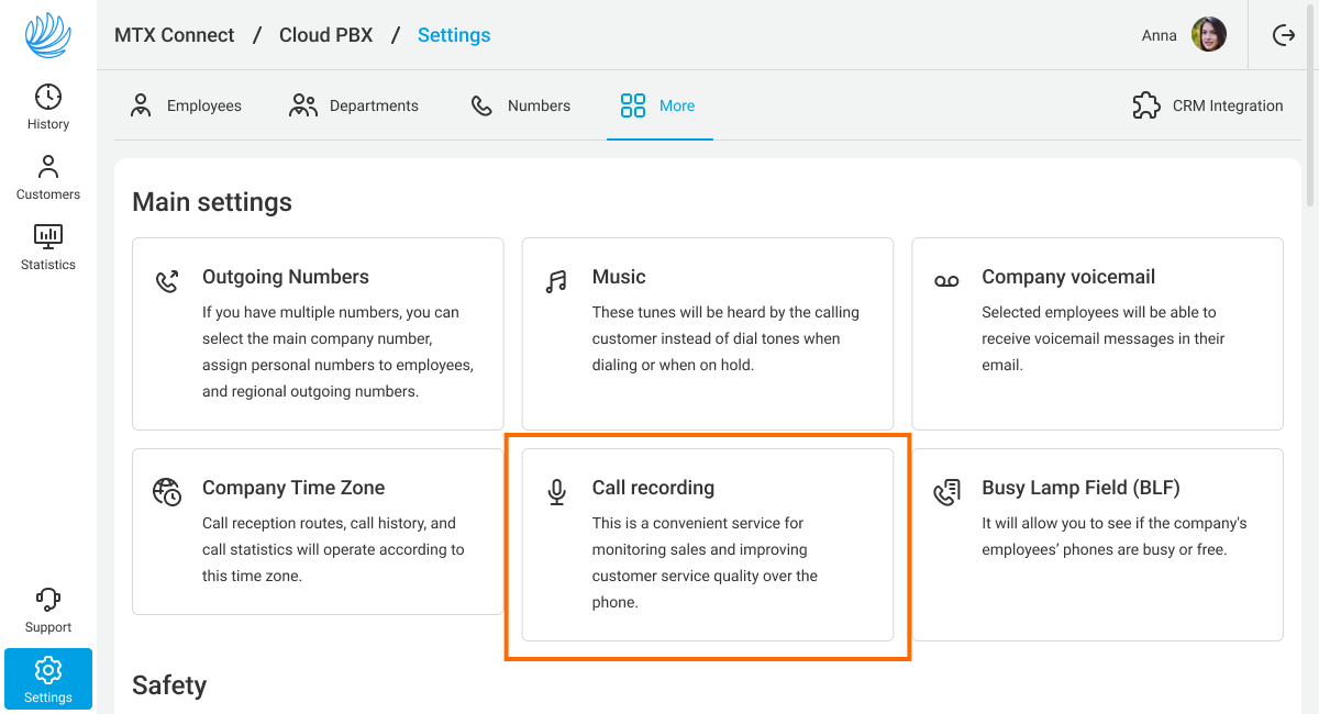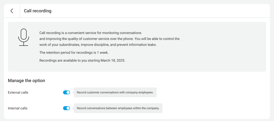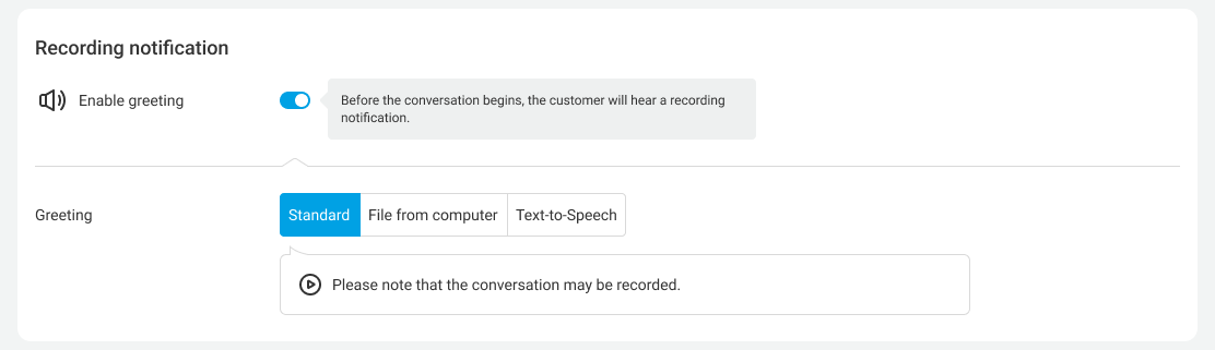 Even for outgoing calls, your customer and your employee will hear a warning about recording. By default, Cloud PBX will play a standard message, but you can replace it at any time with your file from the computer or voice the recording notification text using the Text-To-Speech feature.