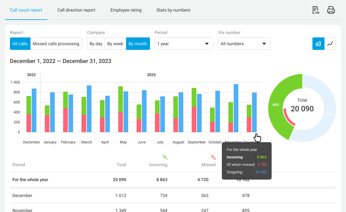 - how many calls were received or missed by employees for each of the marked numbers for the selected period;