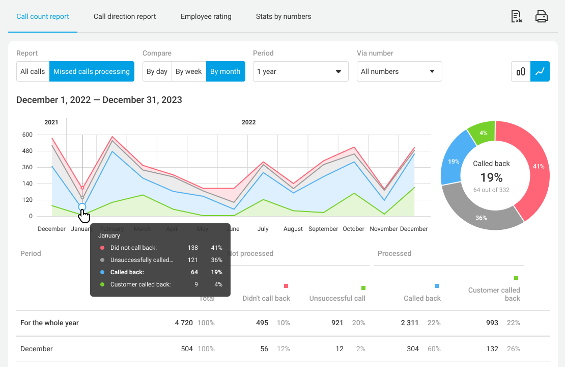 In the table below the graphs, data on all missed calls is conveniently divided into two columns indicating their status: Unprocessed (employees did not call back or did not get through) and Processed (employees called back or the customers called back themselves).