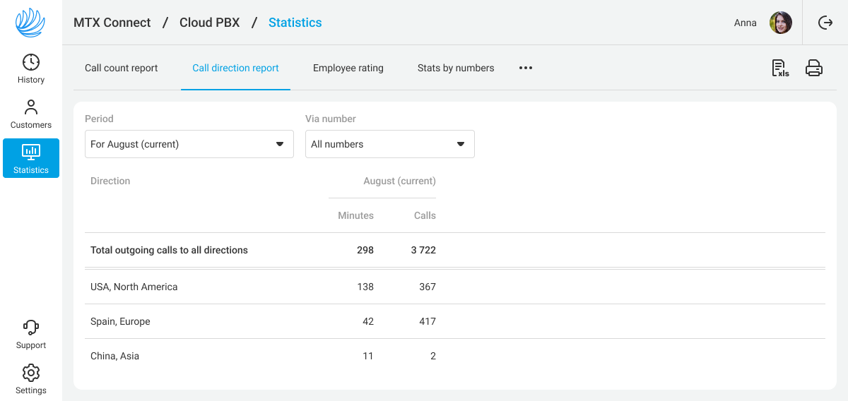 The call direction report shows where your employees call most often. It will help you predict communication costs for the upcoming months and eliminate untargeted calls (for example, if someone constantly calls to countries you do not work with). Additionally, you can adjust employees' work schedules if they have to call multiple customers located in the time zones that don't match the company time zone.