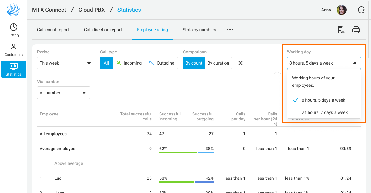 The Hourly Workload report gives an idea of when the amount of calls to the company is at its highest, which means that it is necessary that all employees are ready to answer the phone. It is also likely that due to this report you will reconsider the start and finish times of the working day if it turns out that a significant part of your calls are coming in outside of business hours.