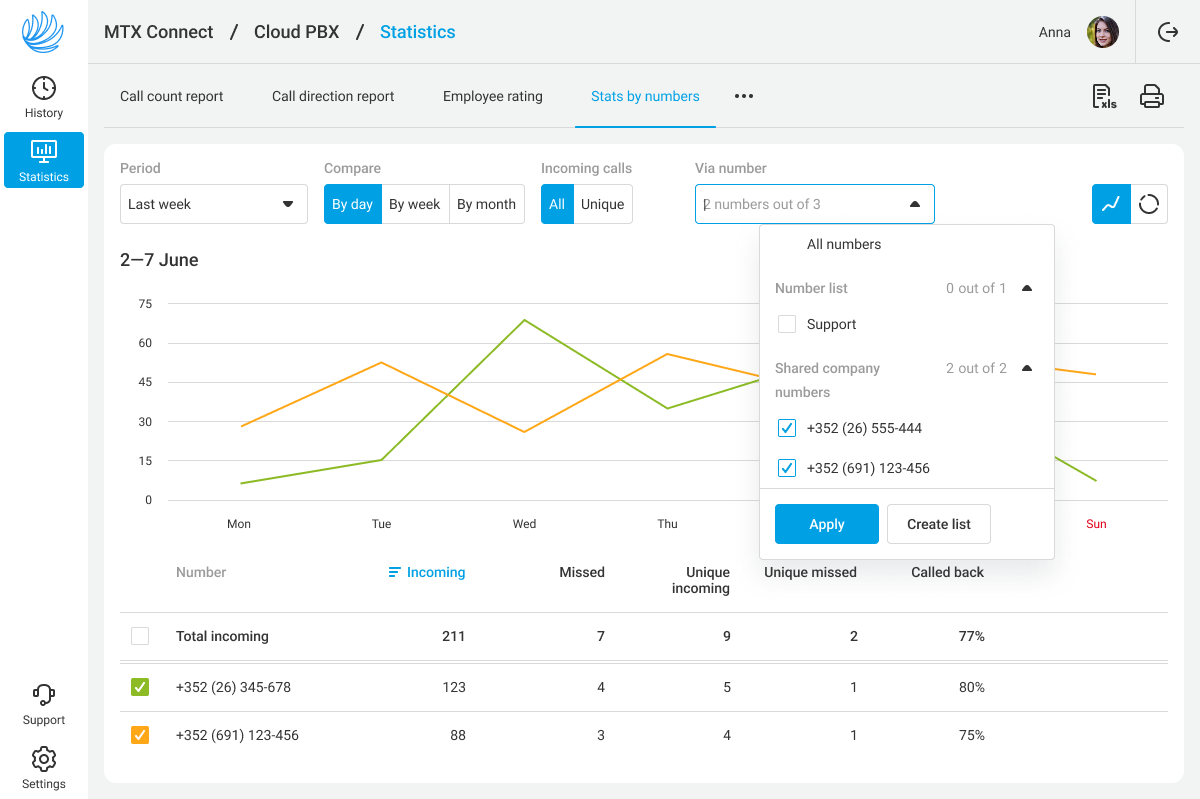 By combining numbers into groups, you can not only evaluate the efficiency of advertising channels, but also compare company departments with each other. For example, which of them pays more attention to communication with customers or misses calls more often and calls back less often. To do this, in the Stats by Numbers report: