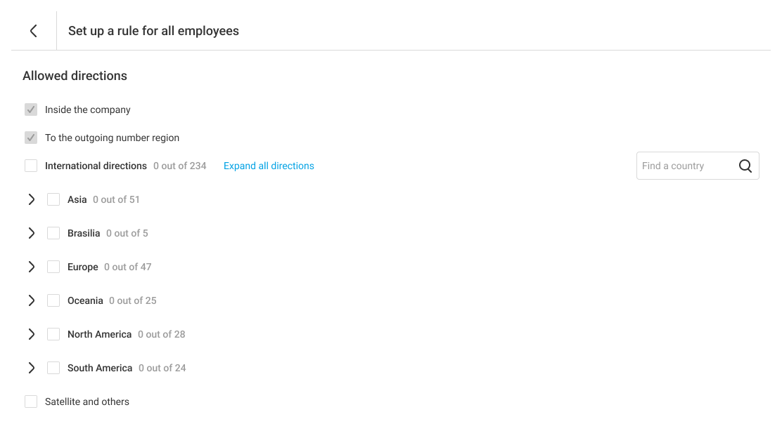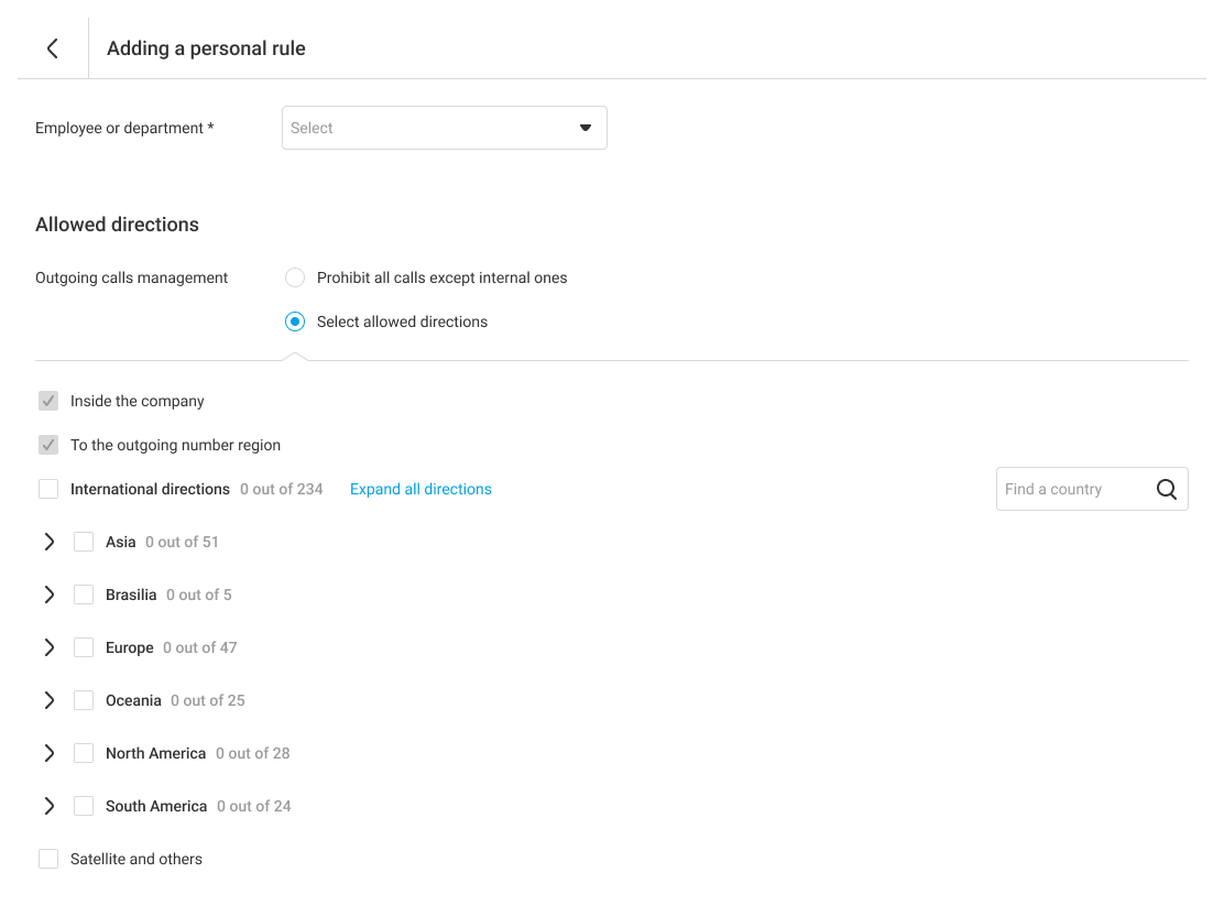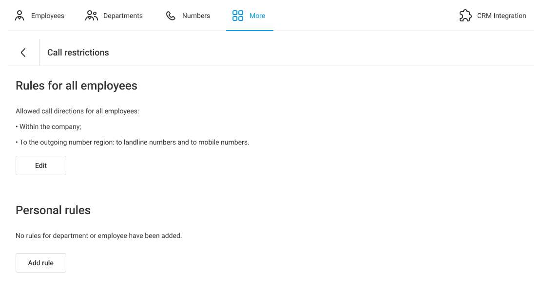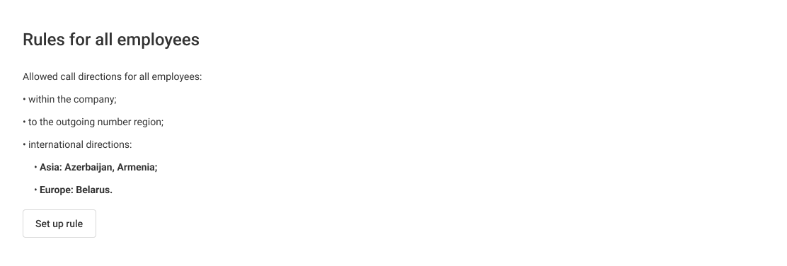 Using these rules you can allow employees to make calls to certain directions or prohibit all outgoing calls except for internal ones and the calls to the region of the outgoing number.