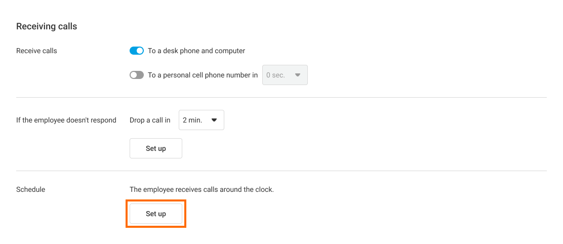 2. In the employee profile settings, scroll down to the Receiving calls section. Find the Schedule section there. By default, the employee is set to receive calls around the clock. To change this, click the Set up button.