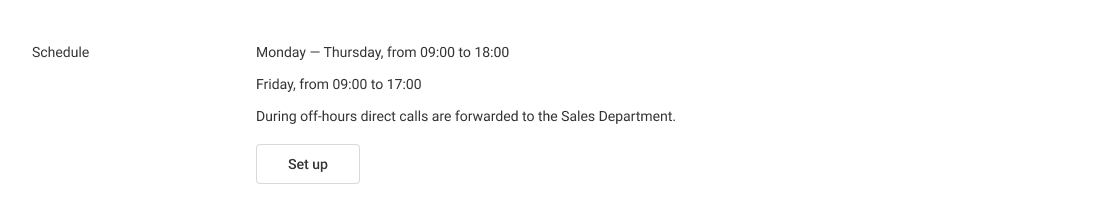 Flexible employee schedule settings allow you to adjust the reception of calls during working and non-working hours once and forget about it until the employee's work schedule changes.
