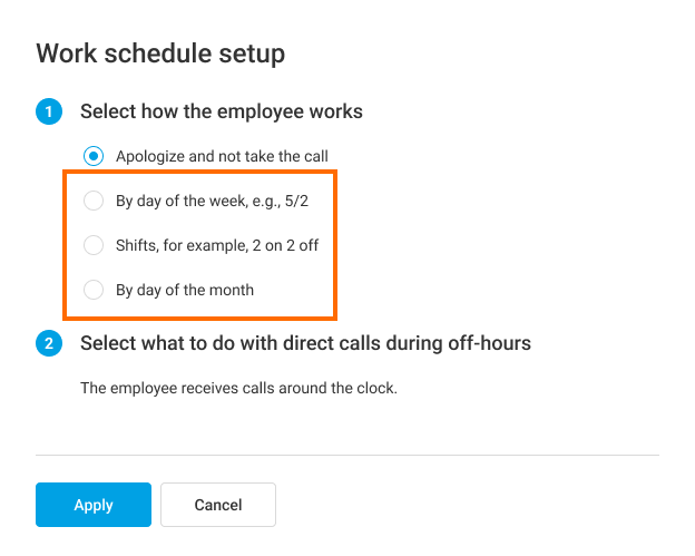 If an employee has a rolling schedule but the work shifts start and end at the same time, then when adding the first shift, specify the work time and click Apply to all days. Then, working hours will be automatically copied to all subsequent shifts. If later you need to change the working hours for all shifts at once, make the changes to the first shift, and then click the Apply to all days button.4. In the pop-up window, select what Cloud PBX should do if an employee receives a direct call during off-hours.
