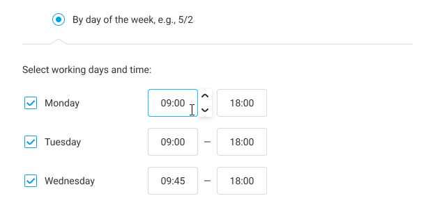 - By day of the week — this is a schedule where working and non-working days are fixed, as in a 5/2 schedule.