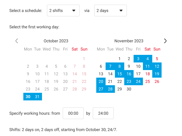 - Shifts, for example, 2 on 2 off – with this schedule starting from the selected date, two working days, and two days off alternate.