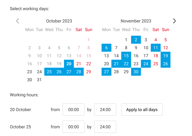 For example, if an employee works from 20:00 on October 25 to 08:00 on October 26, you need to set the working hours for October 25 as follows: from 20:00 to 08:00.