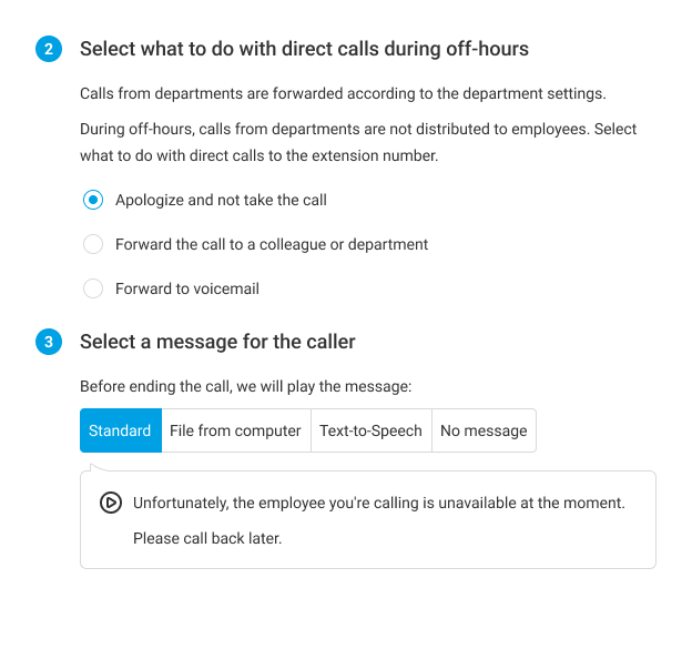 - Apologize and not take the call — if direct calls to an employee do not need to be forwarded to anyone. In this case, when a direct call happens, Cloud PBX will play a message to the customer notifying them that the employee cannot answer; after that, it will drop the call, or the customer will simply hear short beeps (you can specify in the settings which option suits you best).