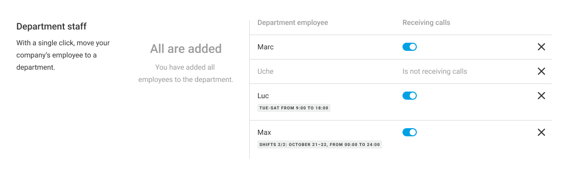 During the employee’s off-hours, a gray badge Is not receiving calls will appear next to their name on the Employees tab.