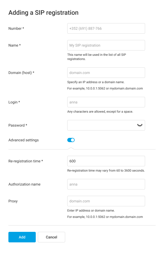 If your operator has provided you with a SIP login, password, and server address, choose SIP registrations. If your operator hasn't provided you with this information but can forward calls to a SIP URI, choose Number forwarding to SIP address.