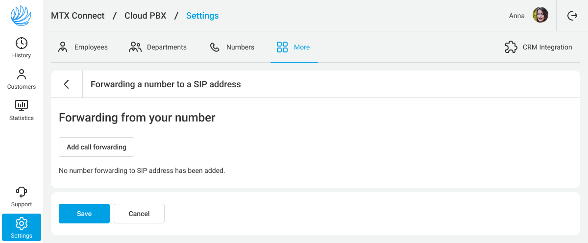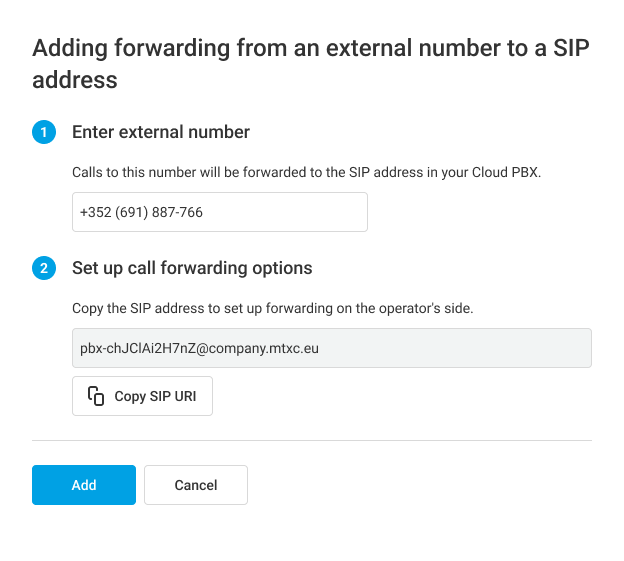 This method is already outdated, but if your current operator cannot provide a SIP-based number, call forwarding remains the only way to connect your number to Cloud PBX. In your operator personal account, set up call forwarding to one of the Cloud PBX numbers, and calls will start coming to our system. The downside of the method is that you will have to pay for call forwarding to your old operator.