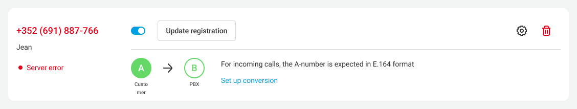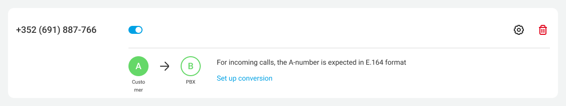 There is also a section called “For incoming calls, the A-number is expected in the E.164 format.” It is technical information, and you do not need to make any changes here in most cases. If your operator doesn't work according to the E.164 standard, you can configure the conversion here.