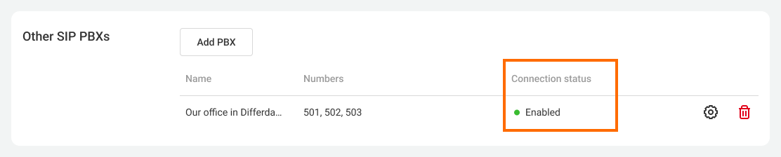After configuring the settings, the status of the SIP PBX connection in the personal account of Cloud PBX will change to Connected and be designated with a green indicator. This means that you now have access to calls using extension numbers between users of Cloud PBX and the connected SIP PBX.