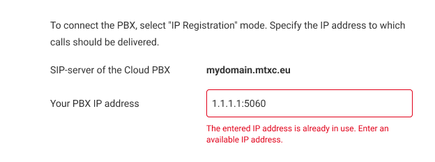 If you want to connect a SIP PBX using SIP trunking, select the IP registration connection type and specify the IP address of the PBX you are connecting to in the format 1.1.1.1:5060.
