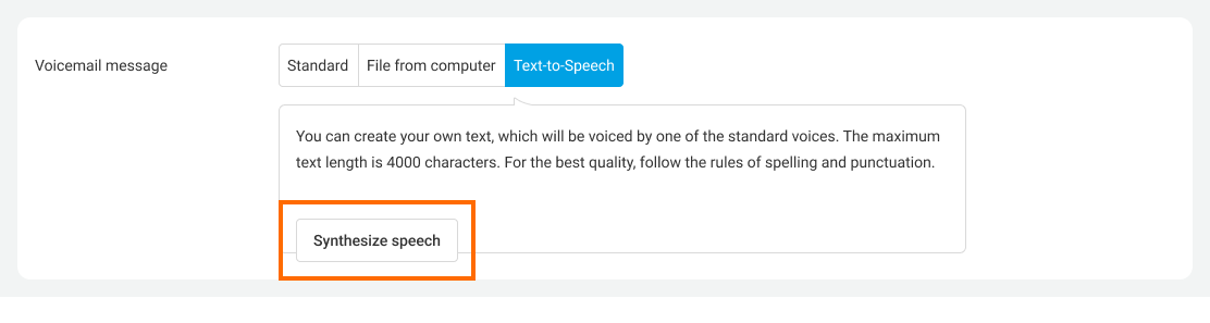 1. In the greeting settings, go to the Text-to-Speech tab and click the Synthesize speech button.