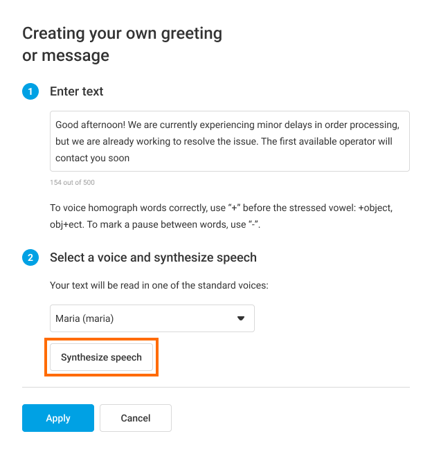 2. Enter your greeting text, select a voice to read it and click the Synthesize speech button.