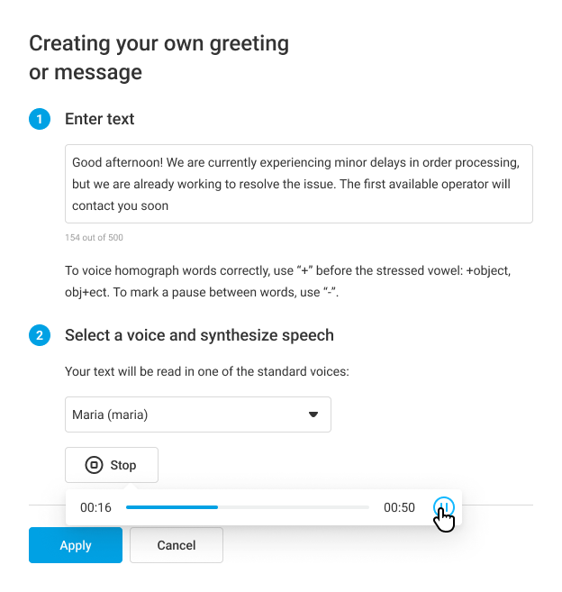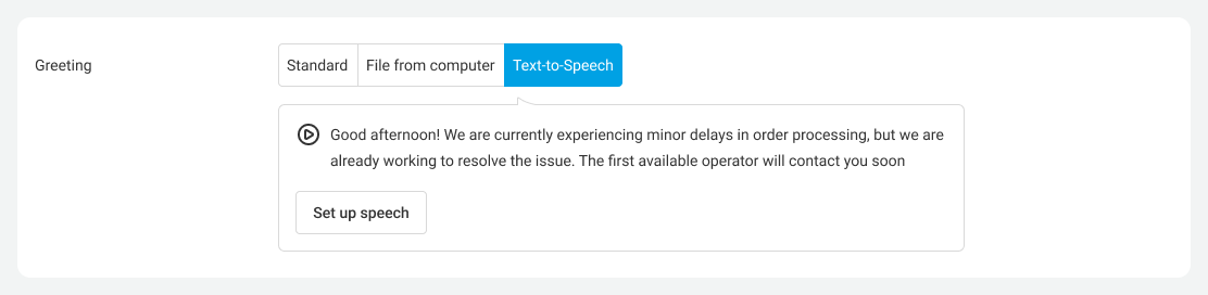 If you need to create a unique greeting file or any other notification in Cloud PBX but you do not have the opportunity to quickly make a studio recording, you can use the Text-to-Speech feature. Just prepare the text of the message and Cloud PBX will read it in any voice you like.