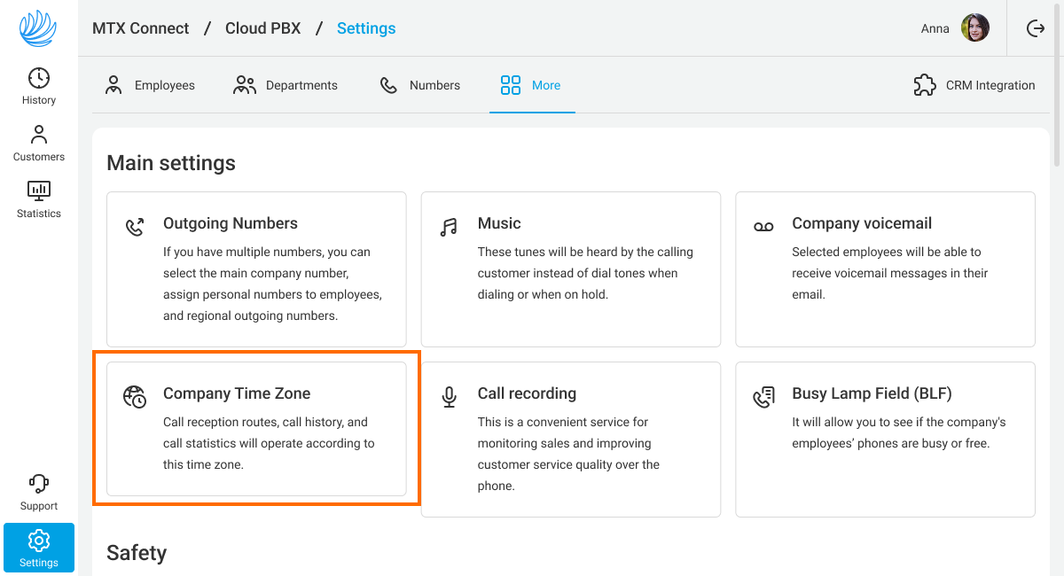 1. In your Cloud PBX settings, go to the More section and select the Company Time Zone section.