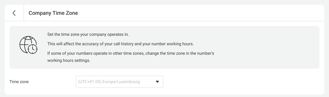 The company time zone is set up for all Cloud PBX numbers and all employees at once. This is done so that the employees working in different time zones do not get confused about the time.For example, colleagues from branches in different time zones when discussing specific calls will be able to use the company time zone instead of the local time in order to quicker and easier find the required conversation in History.
