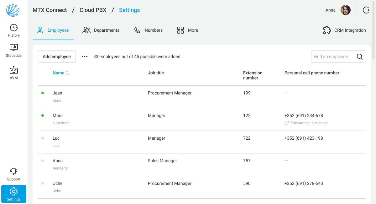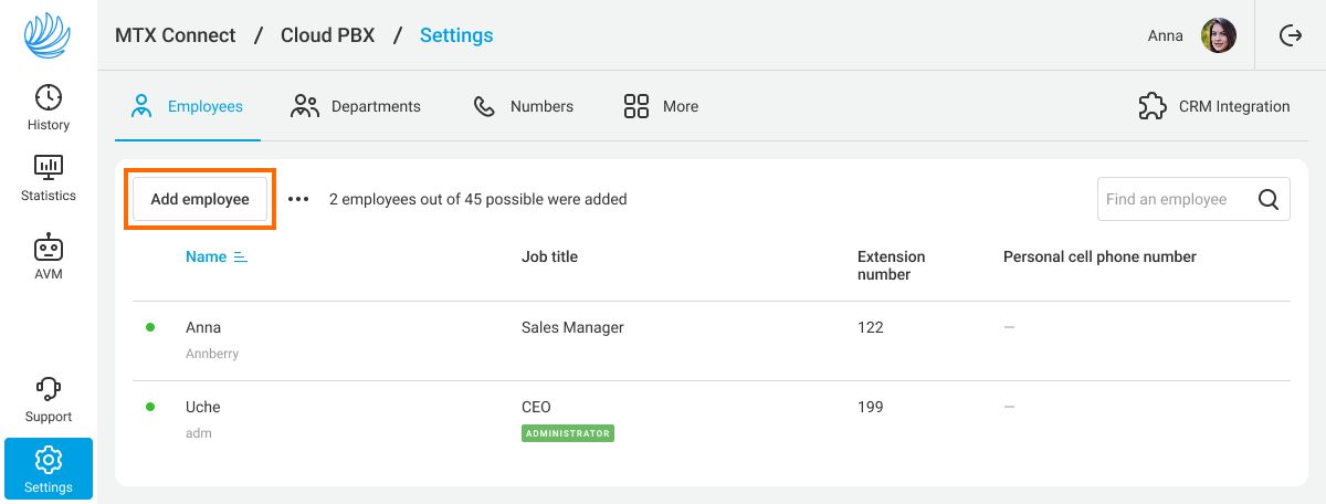 When you log into your cloud PBX account for the first time, you'll be taken to the Employees tab in the Settings section. This is where you can add new employees who will operate the telephony system.