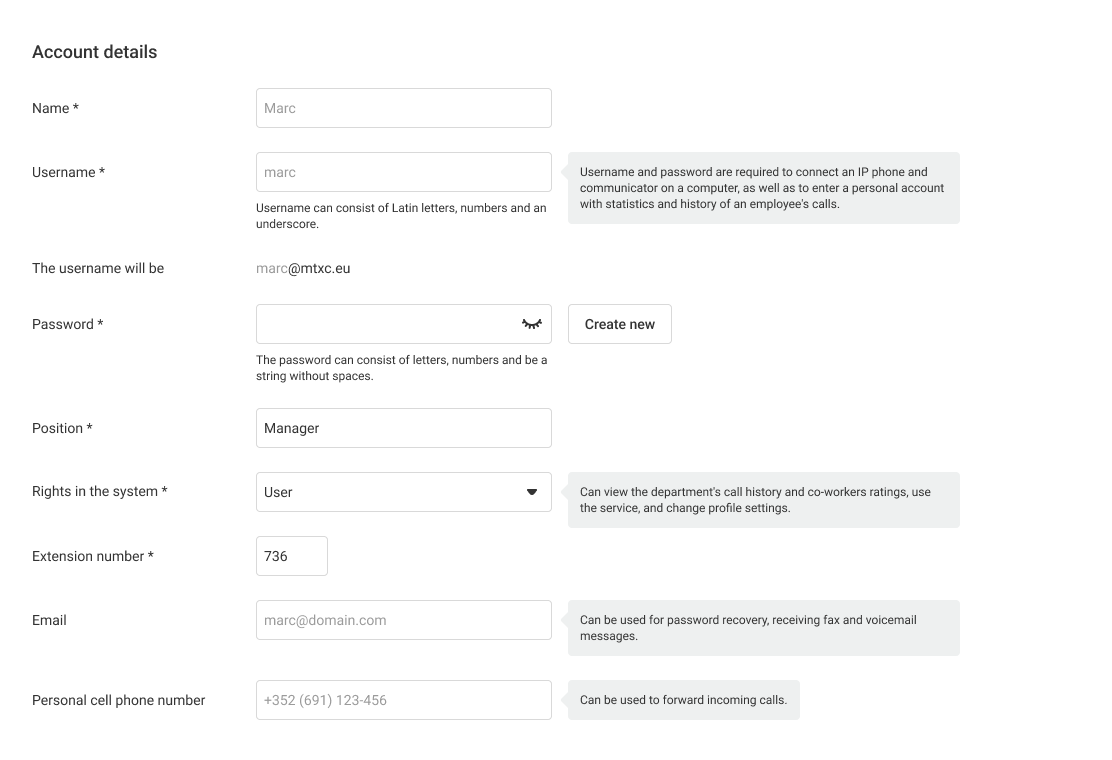 - Personal mobile number. Enter the employee’s personal number. It can be used to recover their password and forward incoming calls.