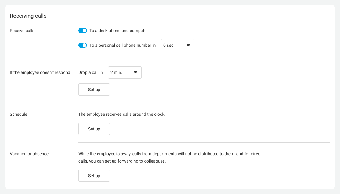 In each employee’s profile, in the Receiving calls section, you can set several call distribution parameters.
